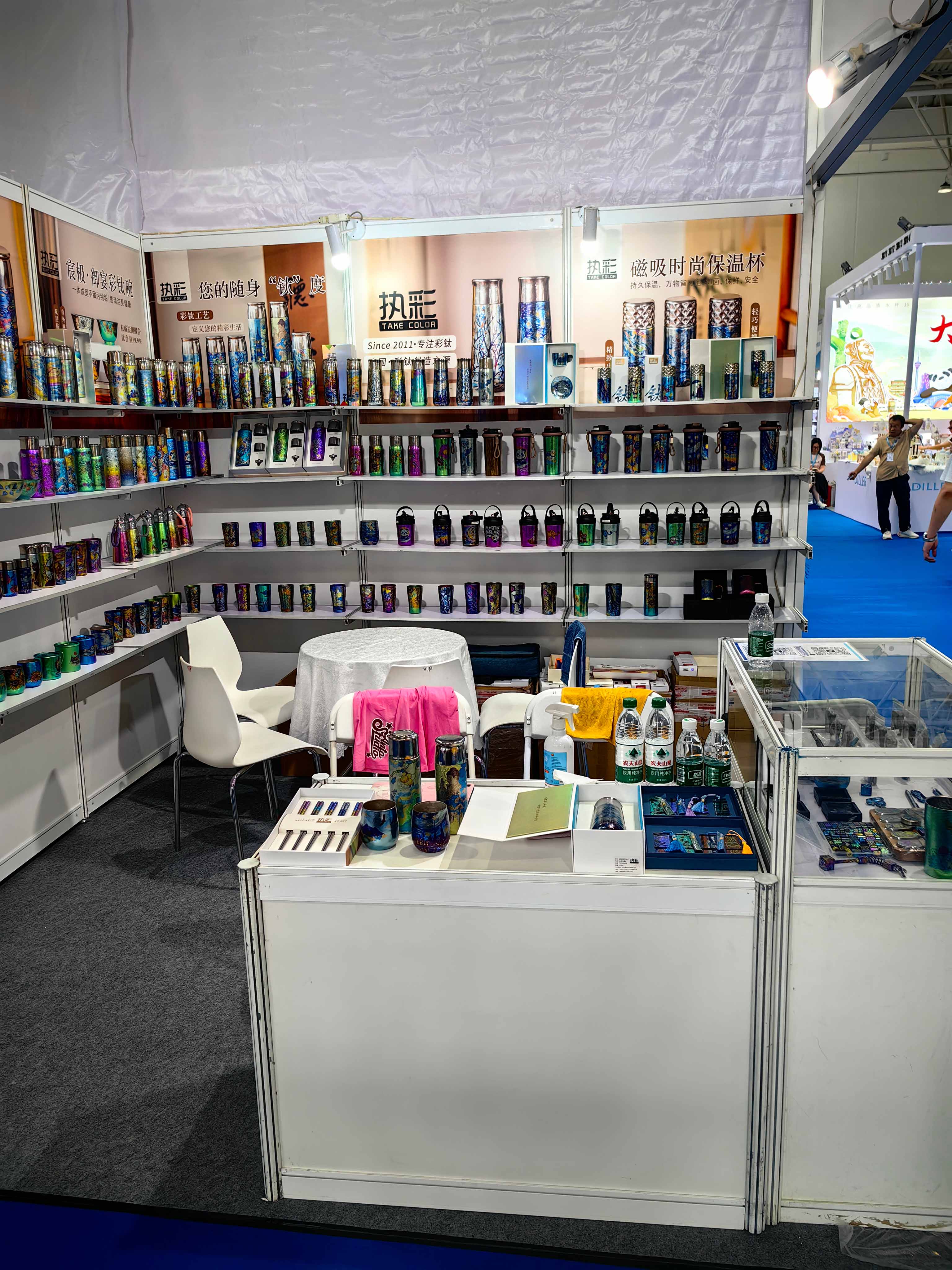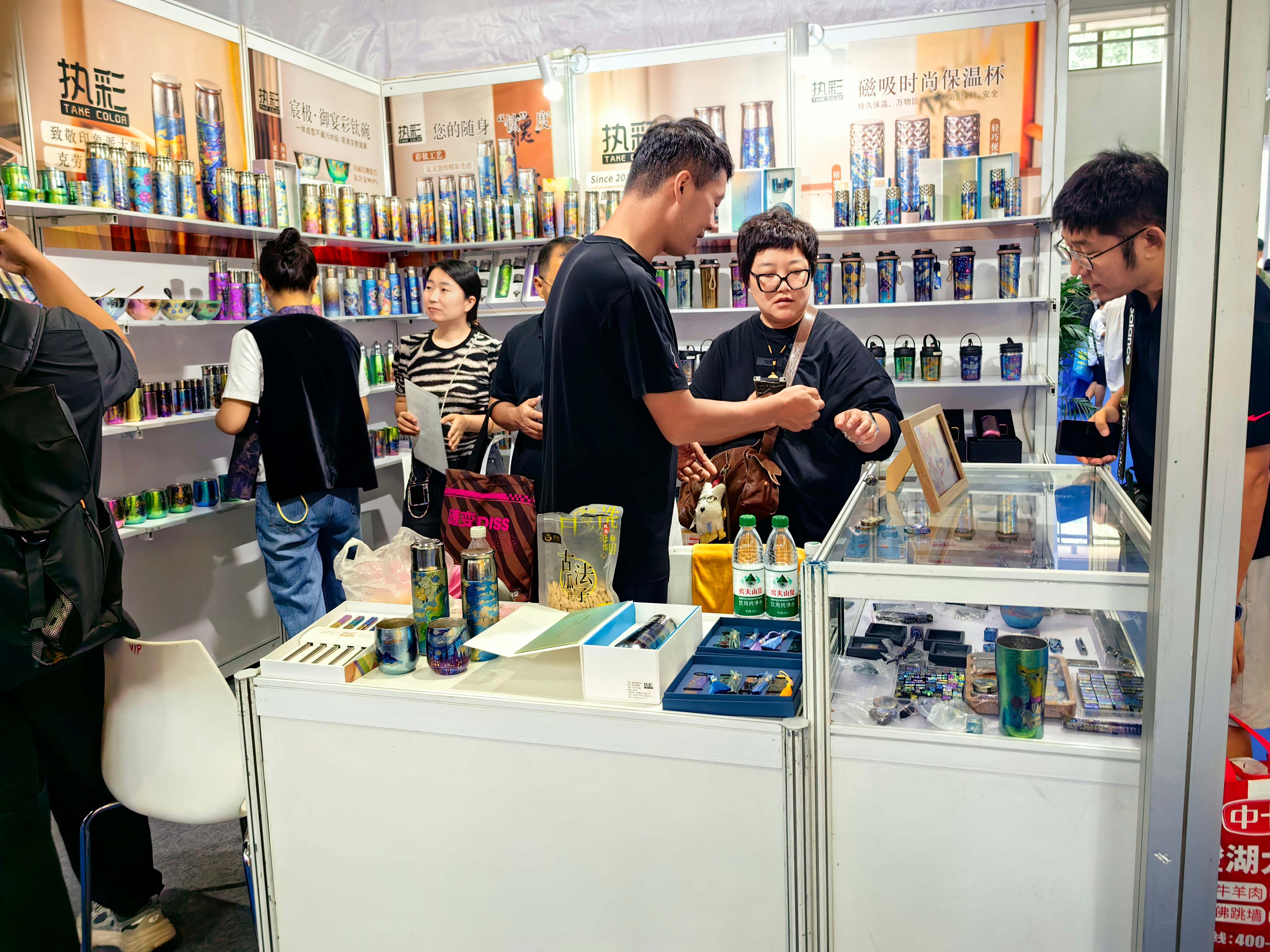 走进 沈阳青蓝钛业有限公司 的展位,科技感与时尚感扑面而来。精心布置的展台上,陈列着琳琅满目的阳极彩钛杯产品,从经典商务款到时尚运动款,从简约设计到个性定制,色彩斑斓、流光溢彩,全方位展示了阳极氧化工艺赋予钛金属的独特魅力。现场高清的产品图片与实物展示相结合,生动诠释了产品轻便耐用、永不掉色、健康环保的核心优势。展会期间,沈阳青蓝钛业有限公司展位始终人流如织,工作人员热情接待每一位到访客商,详细讲解产品特性与应用场景,展厅内人头攒动、洽谈热烈的场景被镜头一一记录,充分展现了市场对健康高端杯具的旺盛需求及对公司产品的浓厚兴趣。